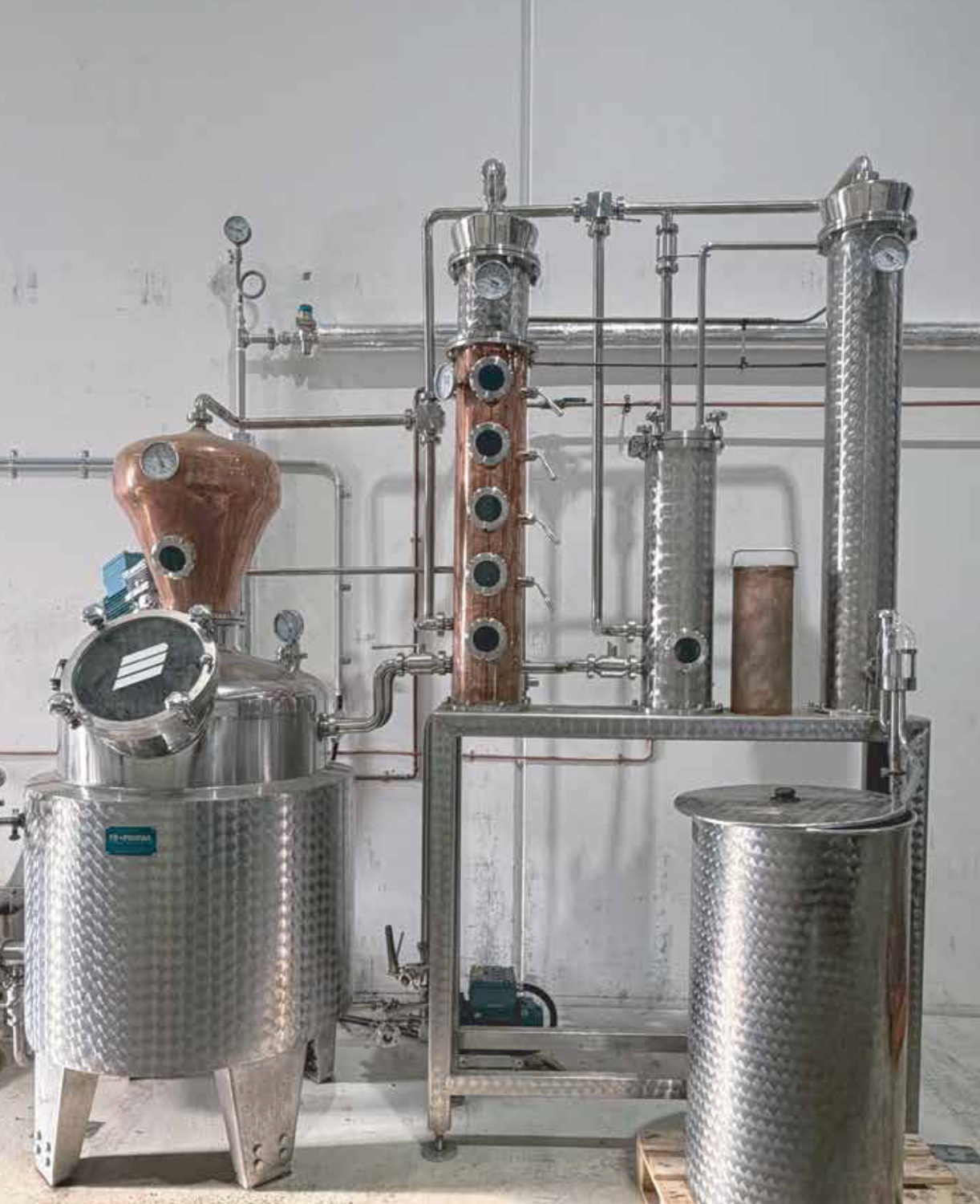 Featuring a 350L hybrid copper still for distilling, large capacity blend tanks, advanced filtration systems, and a multi-line bottling setup to ensure high-quality and efficient production.